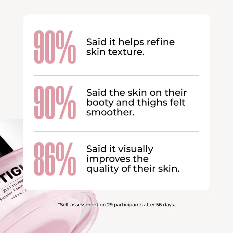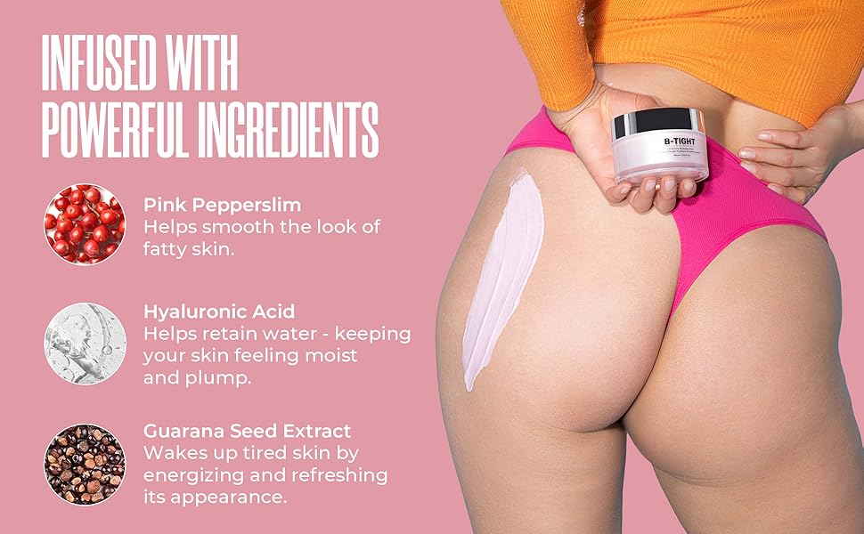 B-Tight™ is more than just a booty cream — it’s a targeted, ingredient-driven formula designed to smooth, firm, and tighten the look of skin in the thighs and buttocks. What sets it apart is its Thermo-Firm Complex — a unique blend of Vanillyl Butyl Ether (for a gentle warming sensation), caffeine-rich Guarana, and Brazilian Pepper Tree Extract to help energize skin, refine dimples, and visibly improve cellulite.